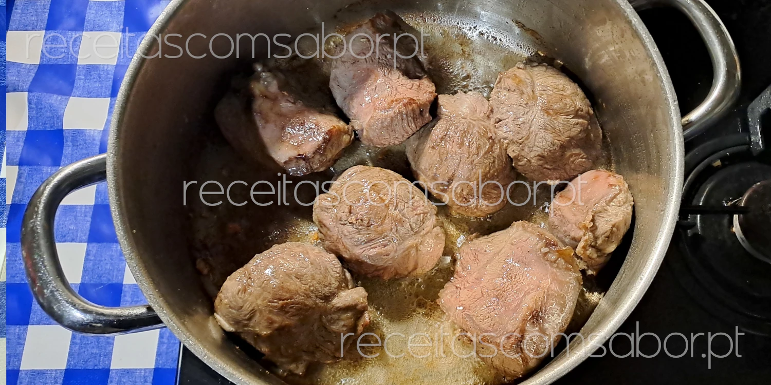 Numa tacho, aqueça o azeite e sele a carne. Adicione as bochechas e deixe dourar bem de todos os lados.